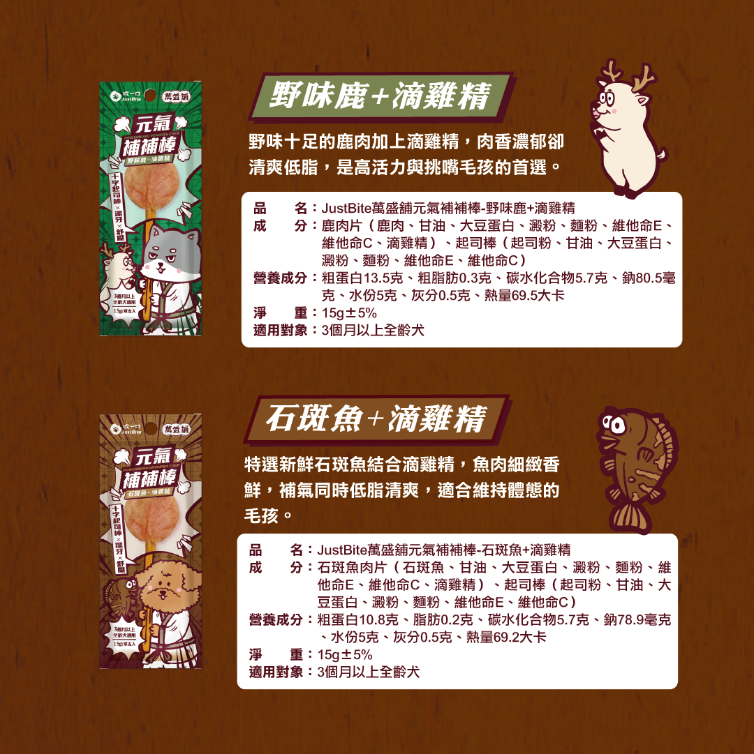 口味:金香雞、活力牛、溫補羊、野味鹿、石斑魚