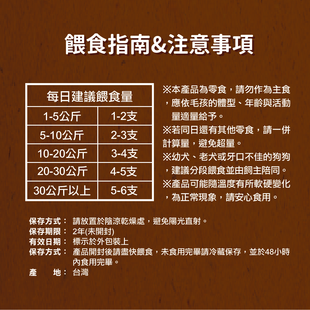 ※本產品為零食,請勿作為主食,應依毛孩的體型、年齡與活動量適量給予。